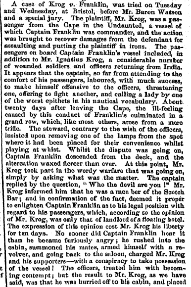 A short version of the story is that Captain Franklin commanded the Undaunted, which sailed in the Spring of 1858 from Calcutta to London. The ship conveyed several passengers, including the Scottish Mr. Krog, as well as British officers and troops that had presumably fought in the recent Indian uprising against the British East India Company. At one point in the long voyage, the passengers were playing a very British game of whist, and the Captain objected to the liberties they were taking in being rowdy at inconvenient times and moving around a lamp for better light. Mr. Krog, who was an attorney, objected to the Captain’s unjust exercise of authority over the passengers, and impugned the Captain’s honor and social status by saying “your ship is a floating hotel, and you are the landlord of it.” The Captain, apparently sensing a mutiny on his hands, flexed his authority further and confined Mr. Krog to his 6’x7’ shared cabin for ten days, chaining his leg to the threshold of the cabin with a 7’ chain. Mr. Krog was offered to opportunity to make peace with an apology to the Captain, but instead filed a lawsuit in Bristol when they returned. The court awarded damages of £375 to Mr. Krog, and a commercial ship master’s somewhat limited power at sea over passengers was duly noted.