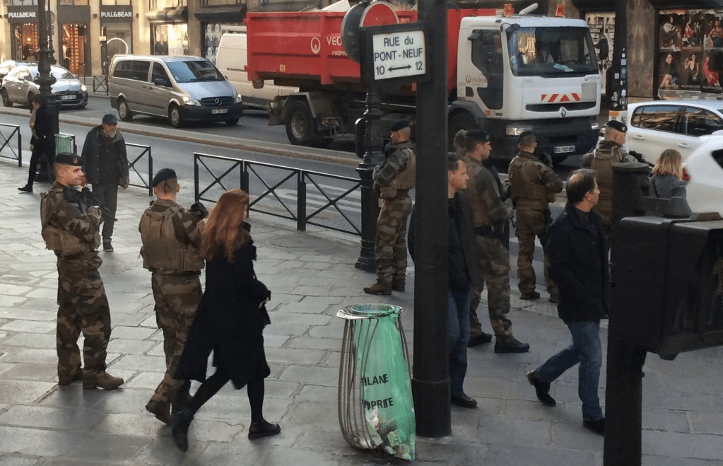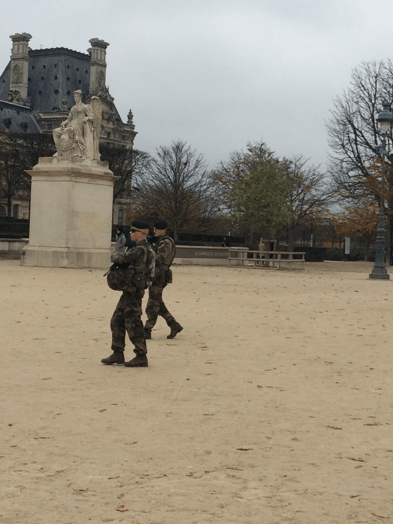 When we arrived, every airport, train station, tourist destination, or busy square had a contingent of men (and occasionally, to my surprise, a woman) dressed in camouflage fatigues/battle dress uniforms, berets on their heads, and rifles—possibly Fusil d’Assaut de la Manufacture d’Armes de Saint-Étienne (FAMAS) or their replacements, HK416F….not that I would recognize either one on sight—slung across their shoulders and always held in a position ready to shoot if needed. Each group had 3-9 people (most often 4-5 men), and one of their group usually carried slightly different equipment on his back, as though he was the medic or the radioman. Each group’s berets varied in shape and style and color, so that the berets they wore marked them as a distinct group even if the way they moved together didn’t already make that obvious.