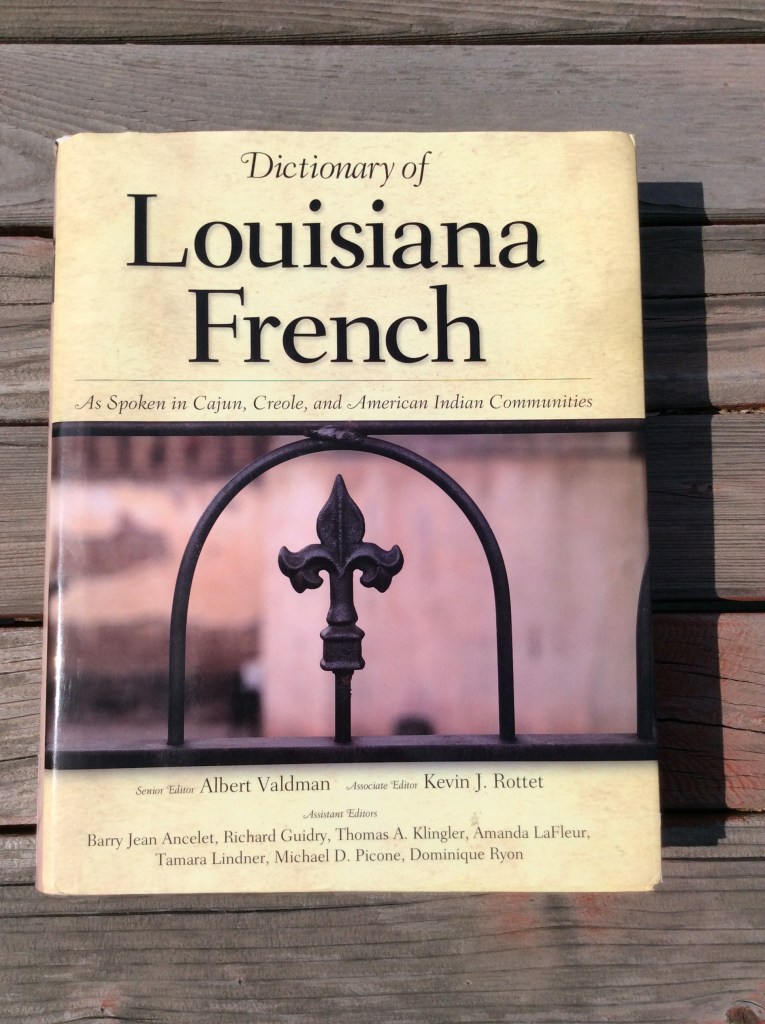 I also hunted down a Dictionary of Louisiana French. I knew there were differences between Louisiana French and the standard French I’d learned in school, but I’m not really sure why it seemed so important to obtain an entire dictionary to ensure authentic diction for (what was then still) a relatively minor character. Except that I like dictionaries, and I seem to be acquiring quite a collection of them in a variety of languages. Mostly it just sat there for a year or so collecting dust next to my other French books, until I encountered a friend who spoke Cajun French. Then I found myself cracking it open nearly every week to discover fascinating new words I could put to practical use.